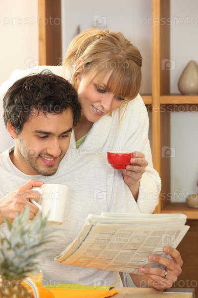 Пара пьет кофе и читает газету вместе