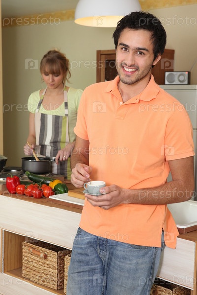 Молодая женщина мешает еду в кастрюле и мужчина держит чашку кофе