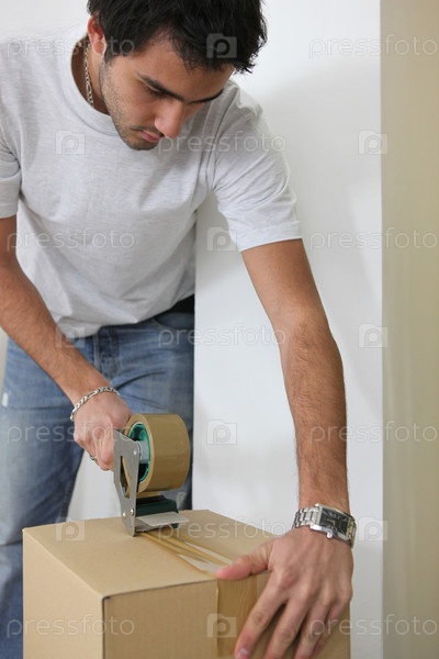 Молодой человек упаковывает коробку