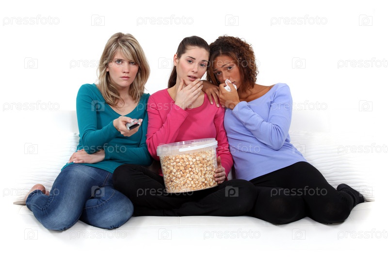Трио девушек плачет над грустным фильмом