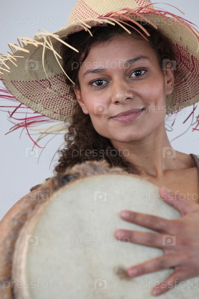 Женщина в соломенной шляпе держит бонго