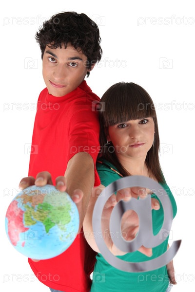 Девушка и юноша с символом электронной почты и глобусом