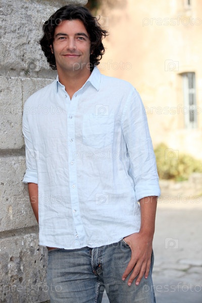 Мужчина стоит, прислонившись к каменному зданию