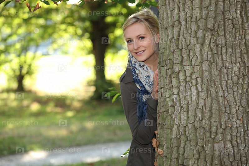 Женщина прячется за дерево
