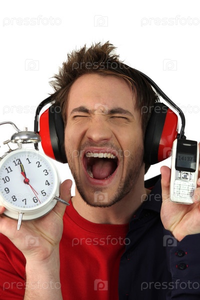 Кричащий мужчина с будильником в руке