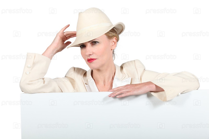 Женщина в кремовом костюме и фетровой шляпе с баннером