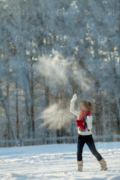 Молодая женщина в меховой шапке играет в снежки