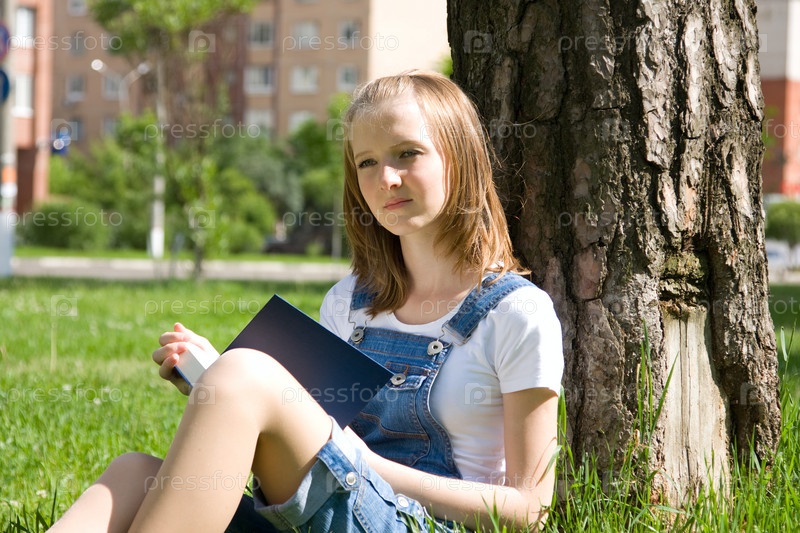 Девочка читает книгу, сидя на траве у дерева