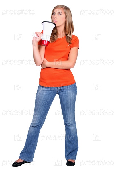 Молодая женщина с мегафоном стоит на белом фоне
