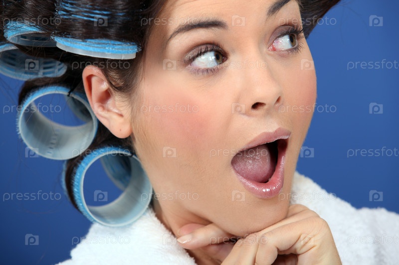 Женщина в бигуди с открытым ртом
