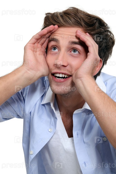 Молодой человек держит руки вокруг глаз