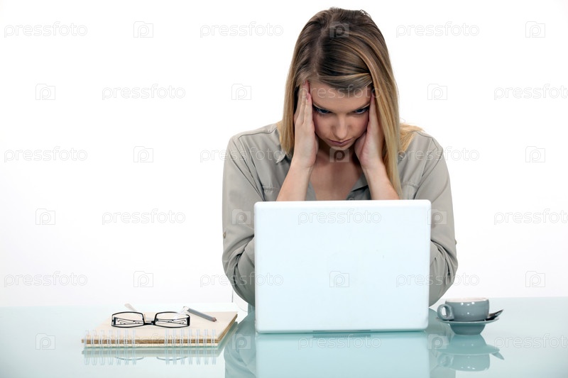 Утомленная женщина работает на ноутбуке