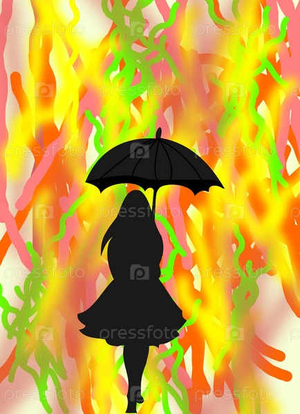 Черный силуэт девочки с зонтом на абстрактном ярком фоне