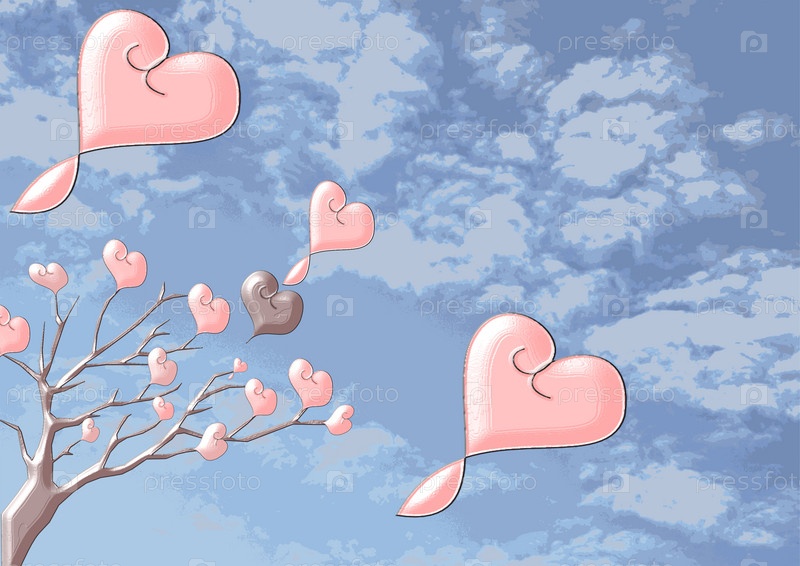 Красивые блестящие деревья с сердечками на фоне облачного неба