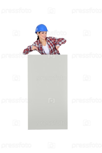 Женщина-строитель стоит с плакатом