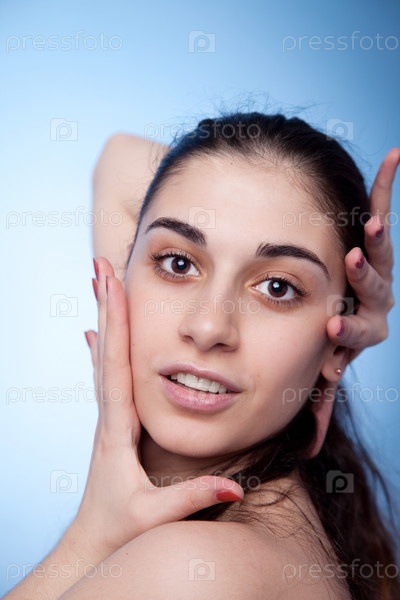 Портрет красивой девушки на голубом фоне