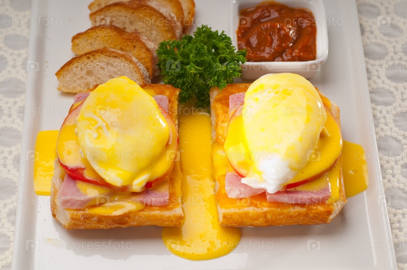 Яйца бенедикт на хлебе с помидорами и ветчиной
