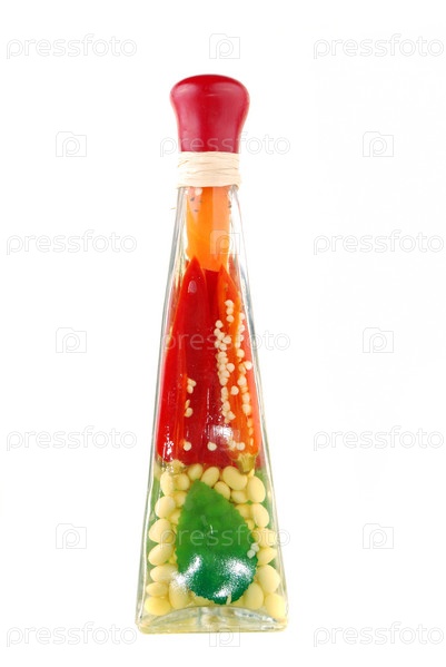 Бутылка со специями и овощами в маринаде