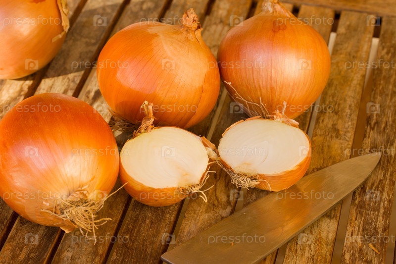 Лук с ножом на деревянном столе
