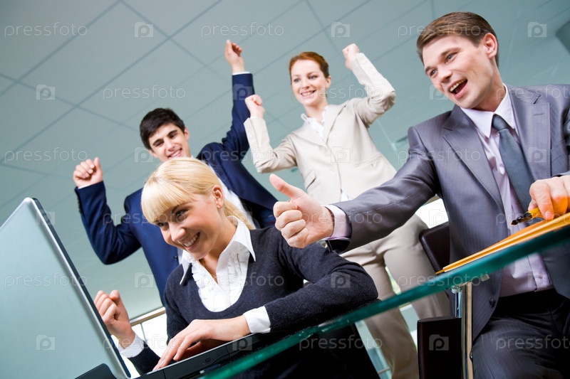 Группа счастливых партнеров смотрят на монитор ноутбука с выражением радости