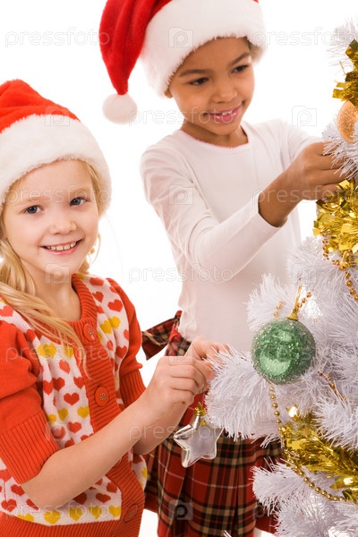 Группа детей у новогодней елки украшает ее золотыми гирляндами и игрушечными шарами