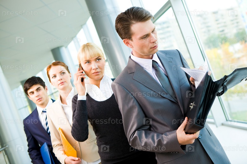Портрет бизнес-группы, стоящей в очереди и выполняющей работу
