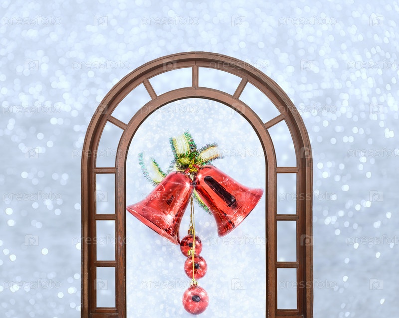 Рождественские колокольчики с бантом на фоне блестящих снежинок