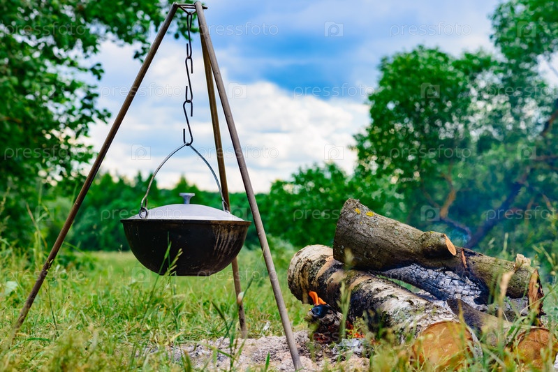 Котел на треноге над огнем