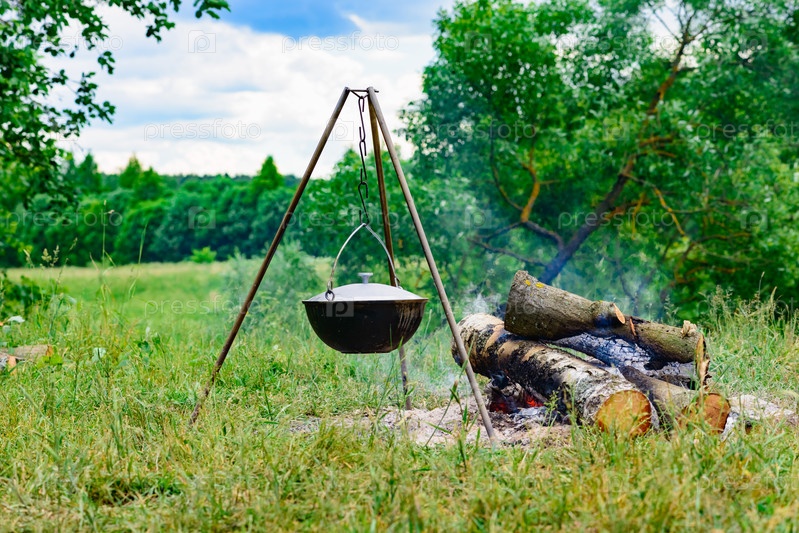 Котел на треноге над огнем