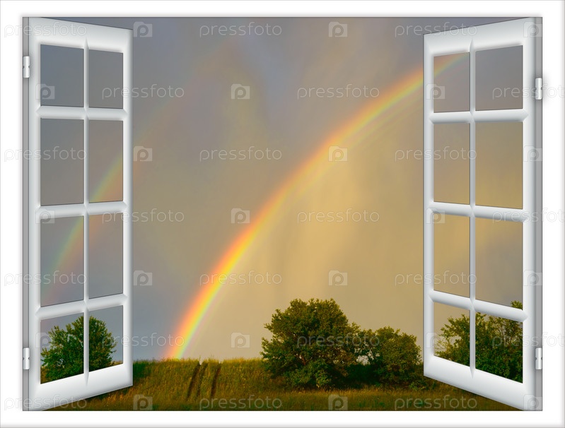 Открытые окна с видом на зеленый луг и радугу