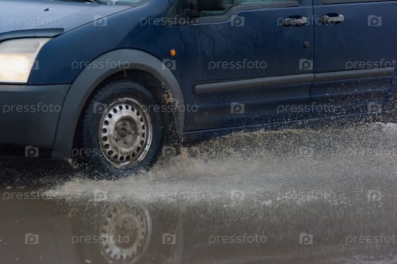 Автомобиль едет по луже