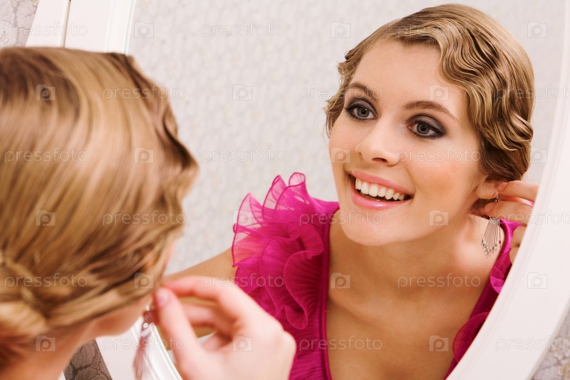 Довольная девушка одевает серьги