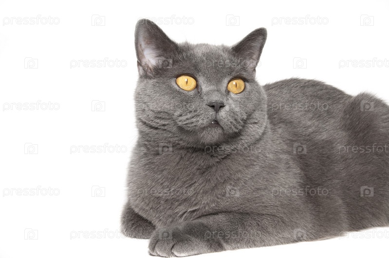 Серая породистая кошка на белом фоне