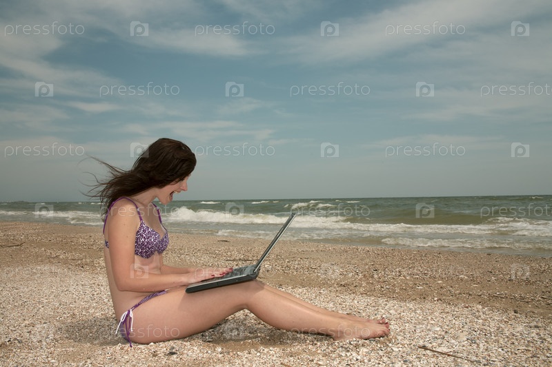 Девушка в бикини работает за ноутбуком на пляже