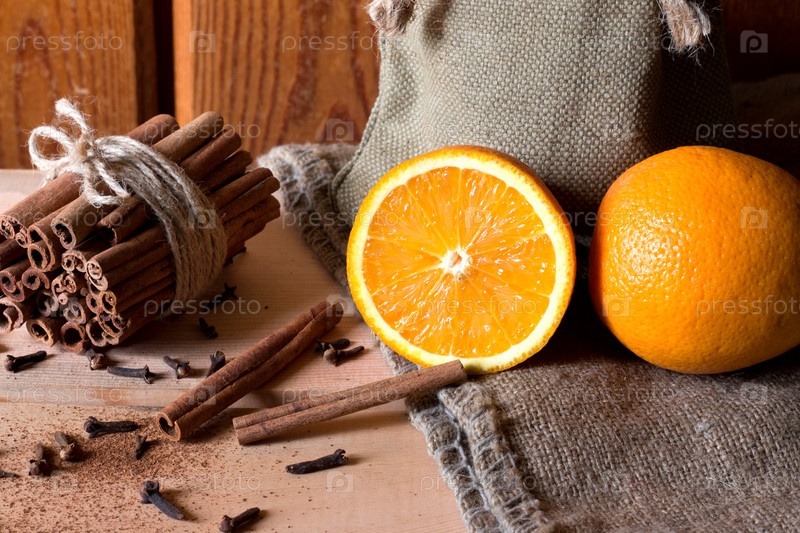 Свежие апельсины с палочками корицы