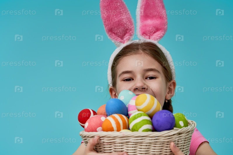 Девушка держит корзину с крашеными яйцами