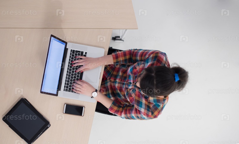Вид сверху молодой женщины, с ноутбуком