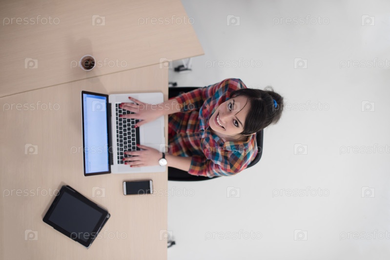 Вид сверху молодой женщины, с ноутбуком