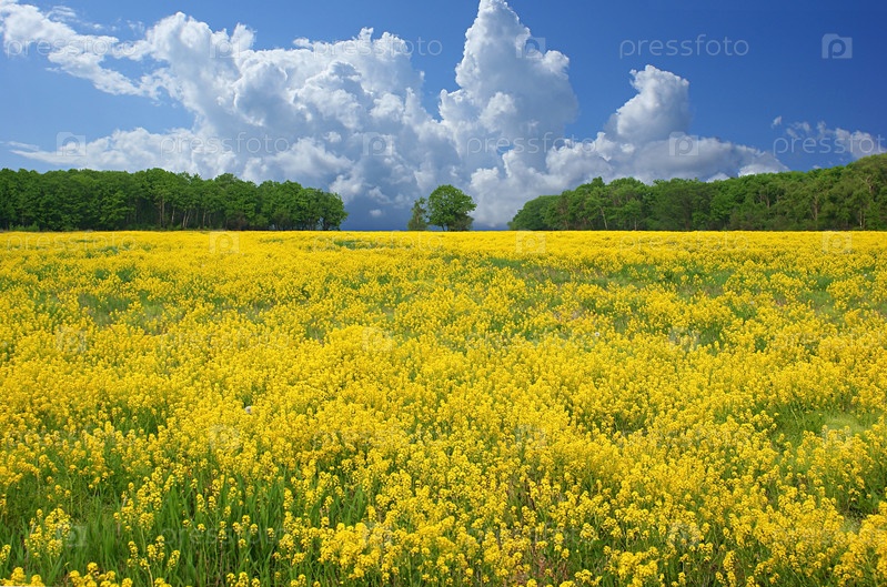 Цветущие желтые поля и голубое небо с красивыми облаками