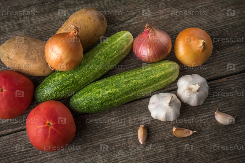 Чеснок, лук, огурцы, картофель и помидоры на старом столе