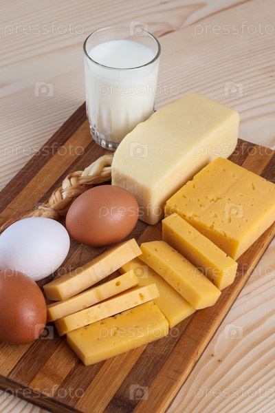 Сыр и молочные продукты на деревянной доске с яйцами