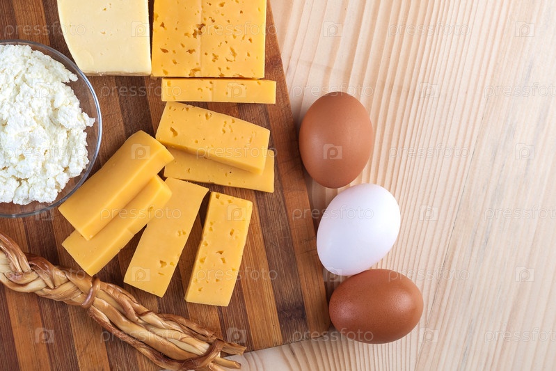 Сыр и молочные продукты на деревянной доске с яйцами