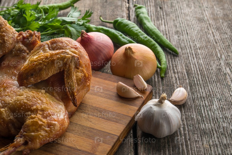 Жареный цыпленок и овощи на старой деревянной доске