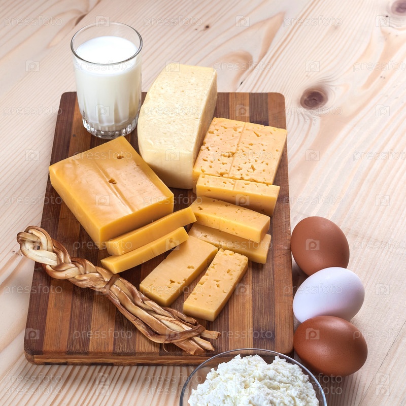 Сыр и молочные продукты на деревянной доске с яйцами