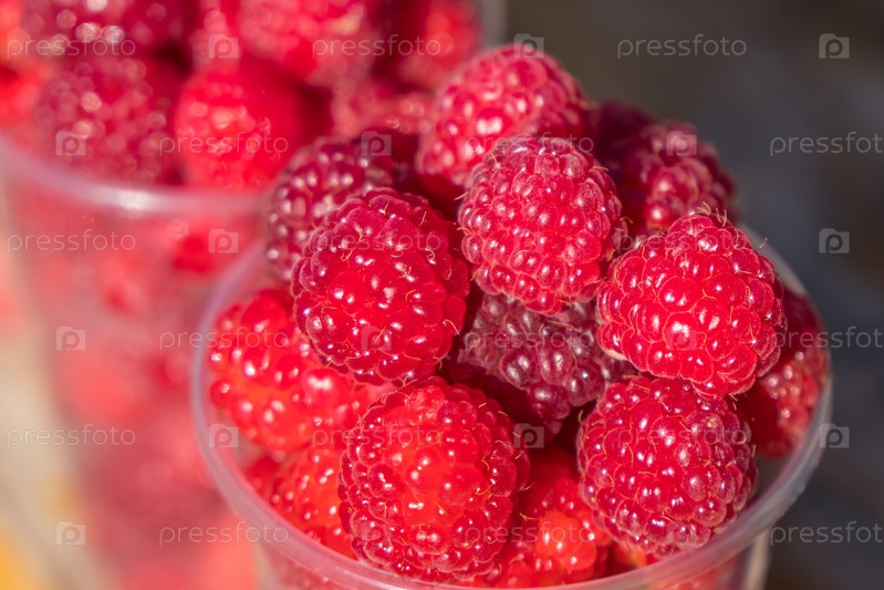 Много малины на прилавке уличного рынка