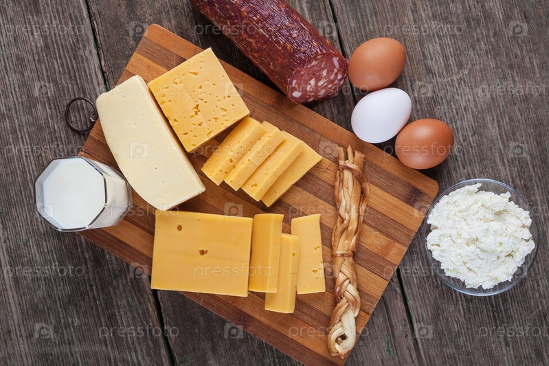 Сыр и молочные продукты на деревянной доске с яйцами и колбасой