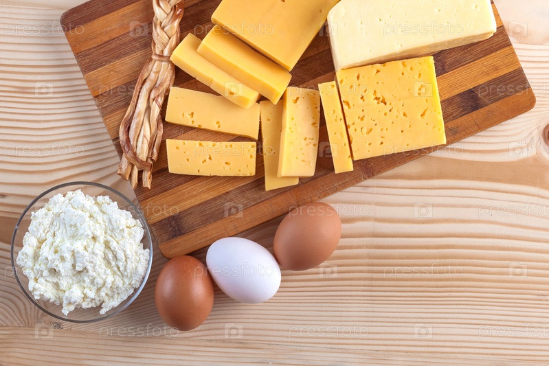 Сыр и молочные продукты на деревянной доске с яйцами