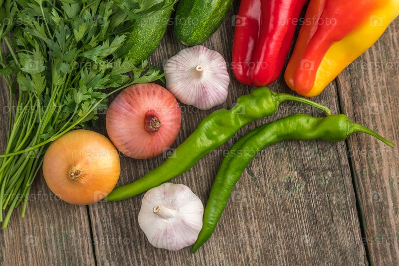 Свежие овощи (перец, чеснок, лук, петрушка) на старом деревянном столе