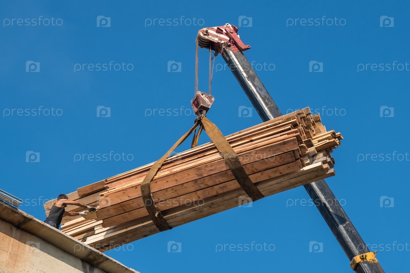 Кран поднимает деревянные рейки