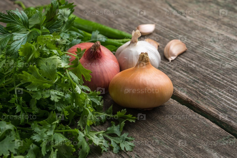 Овощи и зелень на старой деревянной доске